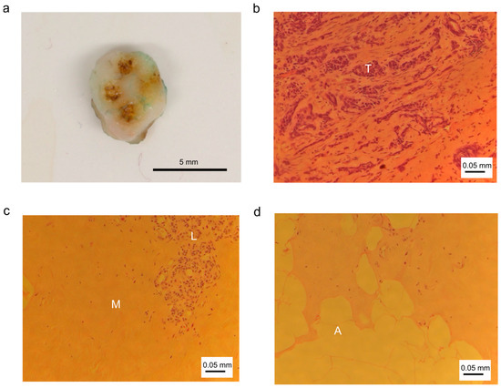 Photographic and histologic images of breast tissue and cells. (a) Tissue sample with coagulation marks; (b) abnormal tissue: tumor tissue with tumor cells (T); (c) normal tissue: connective tissue with muscle cells (M) and lobular cells (L); (d) normal tissue: fat tissue with adipocytes (A).