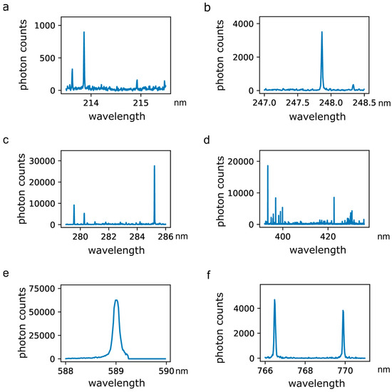 Excerpts of optical emission spectra recorded during the application of RF sparking on human breast tissue. (a) Emission spectra of phosphor (P) and zinc (Zn) atoms including peaks at 213.618 nm, 213.855 nm and 214.914 nm; (b) emission spectra of carbon (C) and iron (Fe) atoms including peaks at 247.856 nm and 248.327 nm; (c) emission spectra of magnesium (Mg) atoms including peaks at 279.522 nm, 279.805 nm, 280.270 nm and 285.213 nm; (d) emission spectra of calcium (Ca) atoms including peaks at 393.366 nm, 396.847 nm, 422.673 nm and 435.838 nm; (e) emission spectrum of sodium (Na) including a peak at 588.995 nm; (f) emission spectra of potassium (K) including peaks at 766.490 nm and 769.896 nm.