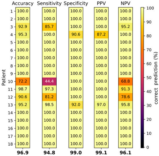 Tissue classification by SVC of 18 individual patients (rows 1–18). Accuracy, sensitivity, specificity, PPV and NPV have been determined (columns from left to right). Correct prediction is depicted by a color range. Values at the bottom of the columns display arithmetic means of all patients.