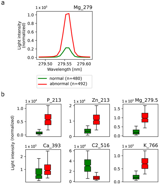 Selected emission spectra in normal and abnormal breast tissue. (a) Mean emission line from magnesium 279.552 nm atom excitation in normal breast tissue (green) and abnormal breast tissue (red). (b) Mean light intensity was averaged over all normal (green) and abnormal (red) spectra of P, Zn, Mg, Ca, C2 and K at the respective wavelength and depicted in box plots. Corresponding standard deviations are shown.