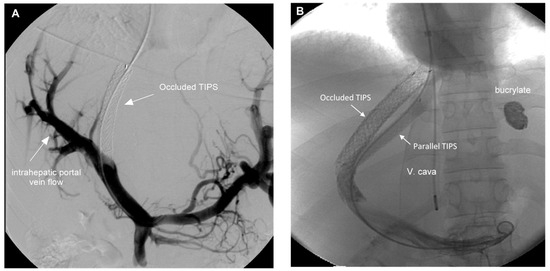(A). Portography of patient #17 five months after TIPS implantation. CDUS showed occluded TIPS in the absence of clinical signs of portal hypertension. The angiogram demonstrates good intrahepatic portal perfusion and the pressure gradient was 10 mmHg. The shunt was not restored and the catheter removed. (B). Portography of a 16-year-old female patient (#4) with fulminant BCS in 1998 requiring early TIPS implantation. After seven revisions between 1998 and 2013 a serious variceal bleeding from gastric varices occurred. The catheterization of the occluded stent-shunt was not possible and a transcaval puncture was performed to implant a parallel stent. The shunt has been fully patent since 2013 and the patient gave birth to a healthy child in 2019.