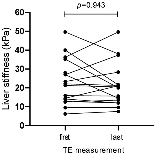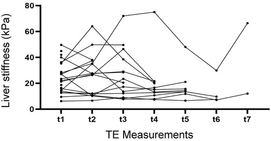 The individual values of the first and last measurements are shown in Figure 2. With a few exceptions, the variations between the two measurements were moderate. The results of the individual longitudinal measurements performed over time are shown in Figure 3. Except for one patient (patient #18), longitudinal measurements did not show relevant deviations from the first measurement or transition from cirrhosis to fibrosis stages I–III or vice versa.