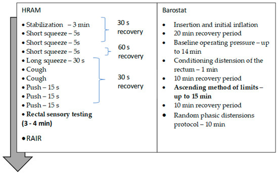 - Sauter, M.; Heinrich, H.; Fox, M.; Misselwitz, B.; Halama, M.; Schwizer, W.; Fried, M.; Fruehauf, H. Toward more accurate measurements of anorectal motor and sensory function in routine clinical practice: Validation of high-resolution anorectal manometry and Rapid Barostat Bag measurements of rectal function. Neurogastroenterol. Motil. 2014, 26, 685–695. [Google Scholar] [CrossRef] [PubMed]