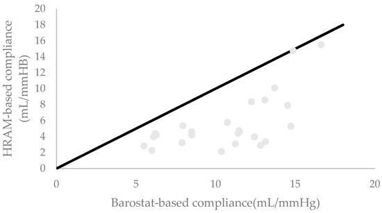 Overall, the corrected and uncorrected HRAM-based compliance values were lower than barostat-based values. HRAM-based compliance based on uncorrected pressures showed a significant correlation with barostat-based compliance at 100% MTV. However, this correlation was weak. For 100% MTV for the group-level correction, 75% MTV and 100% MTV for the individual corrections, we observed significant correlation factors above 0.6. The results are presented in Table 2. Figure 3 shows the HRAM-based compliance at 100% MTV using the group-level correction, plotted against the barostat-based compliance at 100% MTV.