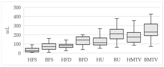 Median sensory threshold volumes with quartiles. FS: first sensation; FU: first urge; IU: intense urge; MTV: maximum tolerable volume.