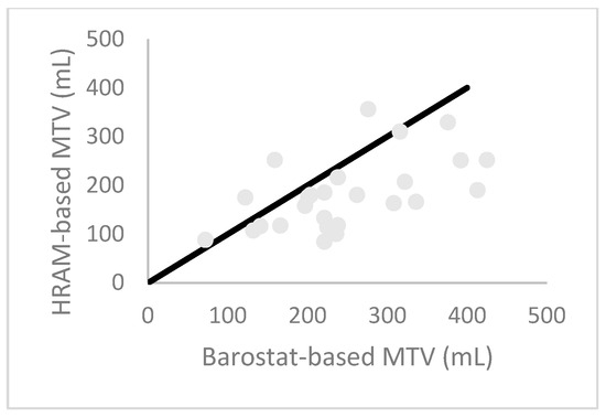 Descriptive statistics for rectal sensory testing are presented in Figure 5. FS showed no significant correlation between the two methods (p = 0.46). FD, U and MTV showed significant correlations (p = 0.008, 0.043 and 0.03, respectively). However, there were no strong correlations (Spearman’s rho: 0.43, 0.40 and 0.57, respectively). Figure 6 shows the HRAM-based MTV plotted against the barostat-based MTV.