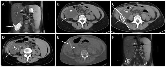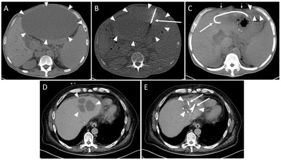Computed tomography (CT) serves as a suitable technique for examining fluid accumulations and determining the necessity for further medical intervention []. The predominant therapeutic approach involves antibiotic treatment in conjunction with percutaneous CT-guided drainage placement (CTD). The latter enables precise localization of the fluid collection and ensures the acquisition of an adequate fluid specimen for microbiological analysis and targeted antibiotic therapy [,,].