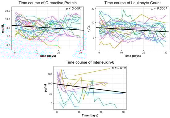 Baseline values (median [25%, 75% quartile]) were 7.9 [4.7, 14.3] mg/dL for CRP; 7.5 (4.7, 12.3) × 109/L for leukocytes, and 241 [83.4, 431.5] pg/dL for interleukin-6.