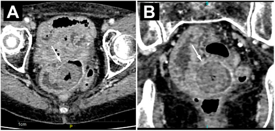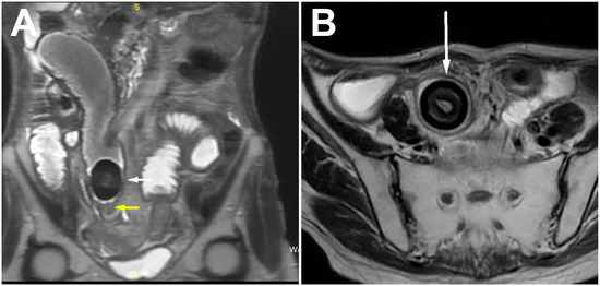 The MRI showed more clearly the layered structure of the described mass due to its better tissue resolution. The low signal intensity at the periphery of the lesion itself corresponded to the calcified component. There was no diffusion restriction in the diffusion-weighted imaging sequence or post-contrast opacification of the lesion. Beneath this clearly formed, calcified bezoar, in the form of a “bezoar egg”, a circumferential narrowing of the ileum segment was observed, which showed the imaging features of a benign fibrous stenosis of the lumen in all cross-sectional examinations performed (Figure 3A,B). Regarding previous radiotherapy, this could be a consequence of the therapy and practically the cause of the bezoar forming with subocclusive symptoms.