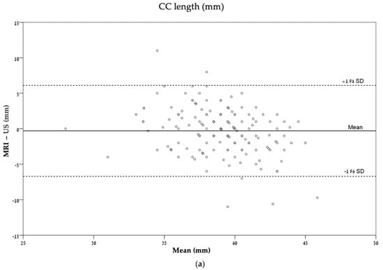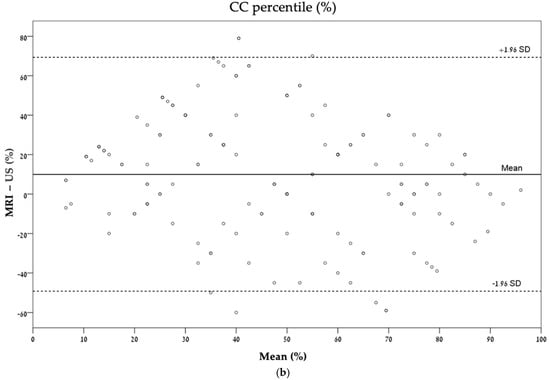 For most variables (TCD percentile, CC length, and percentile), a moderate correlation was found (r > 0.3). However, a positive, strong correlation (r = 0.78) was found in TCD measurements with the smallest mean difference (0.02 ± 2.85 mm) between the two modalities (Table 2).