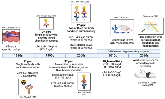 Evolution of troponin measurement assays from the 1980s to the 2020s, and the limit of detection (LoD) associated with each generation of assay. Major papers corresponding to each generation of troponin are referenced as [54,55,56,57,58,59,60,61], based on information from [62].
