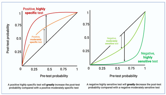 For a given pre-test probability, use of a highly specific test will greatly increase the post-test probability of disease compared to a moderately specific test, if the test result is positive. For a given pre-test probability, use of a highly sensitive test will greatly decrease the post-test probability of disease compared to a moderately sensitive test, if the result is negative.