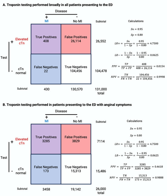 Two 2 × 2 tables and calculations of the positive and negative likelihood ratio (LR+, LR−) and positive and negative predictive value (PPV, NPV). In the top example, (A) troponin testing is performed broadly in all patients presenting to the ED, while in the bottom example, (B) troponin testing is performed selectively in patients who present to the ED with chest pain concerning for ACS. The PPV and post-test probability change dramatically (1.54% -> 46%) based on the pretest probability in the populations we are testing.