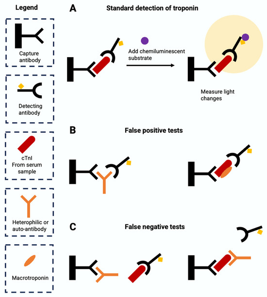 Depiction of molecular mechanisms of common sources of errors in troponin assays. (A). representation of chemiluminescence technology used for troponin detection. (B). Demonstration of false-positive result in the presence of a heterophilic antibody or autoantibody. (C). Demonstration of a false-negative result in the presence of macrotroponin.