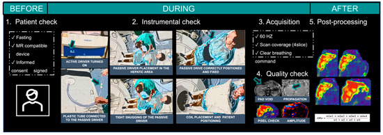 Some important steps before (1. Patient check), during (2. Instrumental check, 3. Acquisition, and 4. Quality check), and after (5. Post-processing) MRE acquisition.