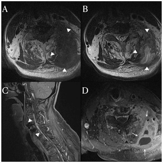 Figure 1). In addition to the soft tissue infection, there was also osteomyelitis in the lamina and transverse processes of the cervical spine, for which vancomycin and a taxolactam (piperacillin sodium and tazobactam) were administered. To address the abscess, a 10 cm incision was made in the left posterior cervical area, allowing for massive irrigation and abscess removal, followed by a curettage of the cervical posterior bony arch. After the abscess removal and bony curettage, primary closure was performed. The duration of antibiotic treatment was anticipated to be between 4 and 8 weeks, depending on the clinical symptoms and the results of the inflammatory markers.