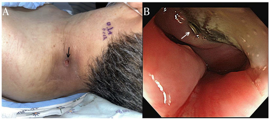 After three months of antibiotic treatment, the patient was discharged due to the improvement of the infection and abscess. However, the patient was readmitted a month later with symptoms of a systemic infection and the formation of an abscess on the posterolateral side once again. To manage the pus drainage, an incision and open drainage were performed. During the subsequent course of antibiotic treatment, food particles were observed in the previously excised drainage pathway. Furthermore, an endoscopic examination revealed an esophageal rupture with protruding hardware of the cervical fusion. (
