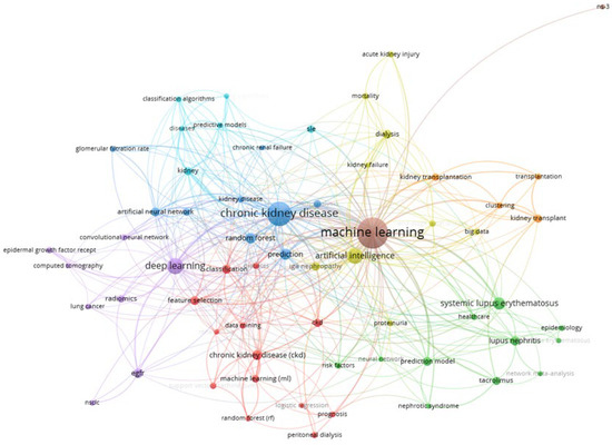 31]. Furthermore, diagnostic tools developed by AI models enhance precision and efficiency in identifying renal abnormalities, thereby facilitating timely interventions. Through bibliometric analysis, this study identified and examined 631 articles focusing on the application of AI in kidney diseases. The analysis unveiled prevalent themes, influential authors, and high-impact journals, providing insights into the most frequently explored topics at the intersection of AI and kidney disease. There has been a noticeable increase in the number of articles focusing on the application of AI in kidney disease, especially after the year 2016. This study also used clustering algorithms to group nodes that share strong connections, creating distinct clusters within the network. The strength of the connections was determined by co-authorship frequency, co-citation strength, or keyword co-occurrence. These clusters are visually represented in varying colors, and the size of nodes acts as an indicator of the significance or centrality of entities within their respective clusters. These findings may help researchers to delve into these clusters, pinpoint influential nodes, and give valuable insights into thematic concentrations and collaborative patterns in the literature.