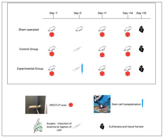 Timeline of the experimental study. All animals underwent SPECT-CT scan 7 days prior to surgery. Day 0 was the day of surgery when sham-operated animals underwent left thoracotomy without any further manipulation, control animals underwent left thoracotomy and surgically induced ischemia via ligation of LAD, and experimental animals underwent left thoracotomy and ligation of LAD followed by installation of stem cells at the point of ischemia in a cross pattern. All animals underwent SPECT-CT 7 days after surgery and 15 days after surgery. Finally, on the 15th day post-surgery, euthanasia took place, followed by tissue harvesting.