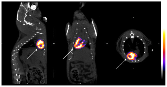 Images of the left ventricle (arrows). SPECT/CT imaging of all axes’ views (longitudinal, sagittal, and transverse from left to right) in healthy myocardium. SPECT-CT images were collected to visualize the myocardial functionality. The color bar indicates the difference in accumulated radiopharmaceutical, directly linked to the level of blood circulation (deep blue being the lowest and white the highest). The color bar indicates a qualitative estimation of myocardial functionality, while quantitative values were extracted from the voxels of each cardiac chamber.