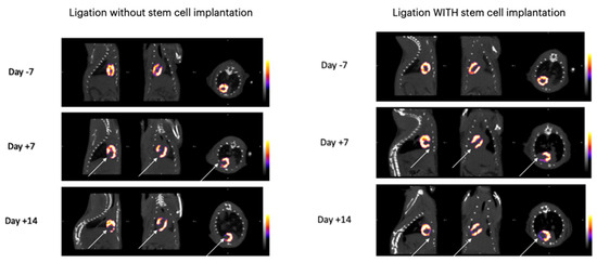 The initial images were evaluated by performing a whole body spiral acquisition in a high-resolution protocol. The visualization was firstly standardized by scanning all the animals before surgery, and the distribution of the radioactive tracer at 7 and 14 days after the surgical ligation of the LAD proved the changes related to ischemia (Figure 2). The differences between the healthy and ischemic myocardial tissue were easily recognized after the axial and 3D reconstruction, leading to the creation of a physiological and anatomical map of the rat’s heart (Figure 2). In the healthy myocardial cells, the radioactive absorbance was high as the cells were highly metabolic, while, in the ischemic cells, the absorbance was decreased or absent (Figure 3, left column). It is notable that, in the animals receiving stem cell transplantation, the SPECT-CT evaluation revealed definite signs of regeneration and an increase in myocardial activity (Figure 3, right column; Figure 4).
