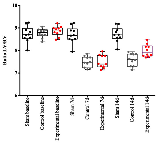 Left ventricle to right ventricle ratio (LV/RV) changes among sham, control, and experimental groups of animals during the period of experimentation. During the period of experimentation, the ratio of the myocardial volume of the left to right ventricles changed according to the presence and the degree of ischemia. In order to compare the variables, both qualitative and quantitative pairwise comparisons between experimental groups were performed using one-way ANOVA with Bonferroni correction and the Chi-square test with Bonferroni correction, respectively. All tests were two-sided. Statistically significant differences were defined by a p-value < 0.05. Black dots represent the sham-operated group, where no change was seen during this time—the LV/RV ratio was about 8.7 ± 0.3 at every measurement (days −7, +7, +14). Grey dots represent the control group, where the LV/RV ratio decreased after the ligation of the LAD and remained low during the period after LAD ligation and establishment of ischemia—the LV/RV ratio was about 7.5 ± 0.27 (days +7, +14). Red dots represent the experimental group, where the LV/RV ratio decreased after ligation of the LAD—LV/RV ratio was about 7.59 ± 0.28 (day +7). It tended to return to normal on day +14 following stem cell administration—LV/RV ratio was about 8 ± 0.27 (Day +14).