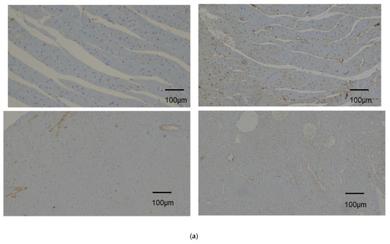 Strong immunostaining in myocardial cells was considered positive. The comparison and results are summarized in Table 2 and the immunohistochemical analysis results are illustrated in Figure 6a,b. There was a statistically significant difference between groups regarding the percentage of positive results for the CTGF variable (p = 0.011), as well as with the CD133 variable. Pairwise comparisons showed that the experimental group that received the stem cells presented a higher percentage of positive results for the CD133 variable compared to the sham-operated (p < 0.005) and control groups (p < 0.005), respectively. There was also a statistically significant difference between groups with respect to the percentage of positive results for the GATA4 variable (p < 0.005). Pairwise comparisons showed that the experimental group (stem cells) presented a higher percentage of positive results for the GATA4 variable compared to the sham-operated (p < 0.005) and control groups (p < 0.005), respectively. There was a statistically significant difference between groups with respect to the percentage of positive results for the Nkx2.5 variable (p < 0.005). Pairwise comparisons showed that the experimental group presented a higher percentage of positive results for the Nkx2.5 variable compared to the sham-operated (p = 0.045) and control groups (p < 0.005), respectively. These favorable findings indicate the beneficial effect of SCT in this rat model, in terms of the regeneration of the ischemic myocardium (Figure 6a,b).
