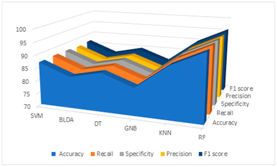 Results of the data analysis conducted by RF and different ML algorithms mentioned before —SVM, BLDA, DT, GNB, and KNN—are presented in Table 5 and Figure 2. As observed, the GNB and BLDA algorithms exhibit the lowest degree of accuracy, just surpassing 80%. KNN demonstrates the highest accuracy, around 90%, but this is still inferior to the one achieved by RF, which reaches 95%. These findings are consistent when analyzing recall, precision, and the F1 score were analyzed.