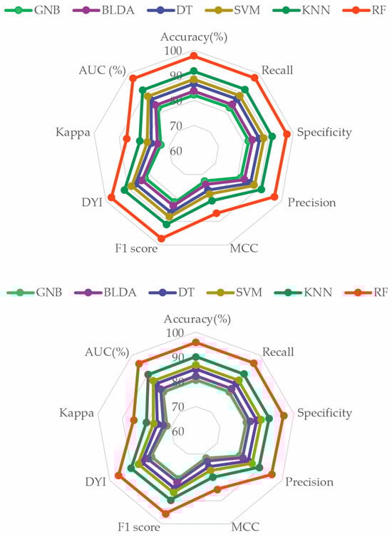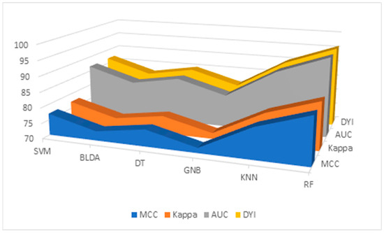 Additionally, the results for the MMC, AUC, DYI, and Kappa index are given in Table 6 and Figure 3, for all the proposed methods. GNB shows the lowest results, with an MCC of 71.64, DYI of 80.73, and Kappa of 71.88. Our proposed RF system exhibits an MCC of 85.13, DYI of 95.94, and Kappa of 85.41, clearly outperforming the other algorithms, such as KNN, SVM, DT, and BLDA, which have lower values. These results, along with those presented in Table 3, indicate that the RF algorithm, among those proposed in ML, was the most suitable algorithm for data analysis and the development of the proposed predictive model.