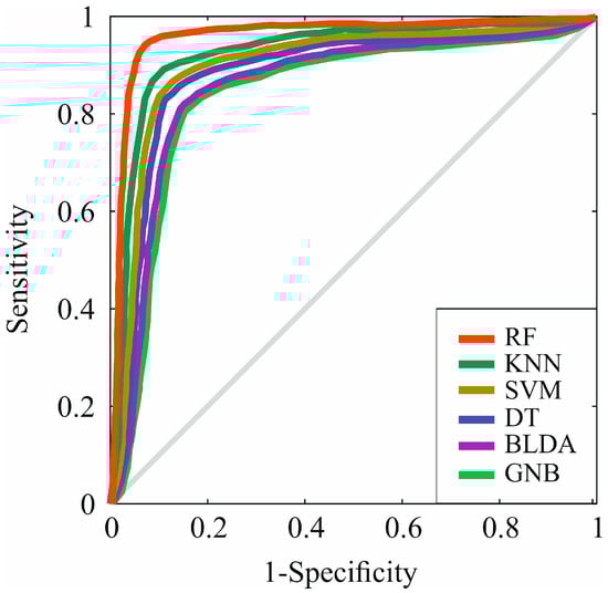The RF algorithm was compared with other ML methods to verify its accuracy. The algorithms used for comparison were support vector machine (SVM), Bayesian linear discriminant analysis (BLDA), decision tree (DT), Gaussian naïve Bayes (GNB), and K-nearest neighbors (KNN).
