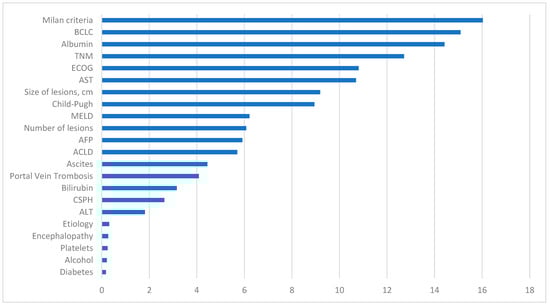Representation of the importance of each variable in the machine learning predictive model. BCLC: Barcelona Clinic Liver Cancer, TNM: tumor node metastases, ECOG: Eastern Cooperative Oncology Group, AST: aspartate aminotransferase, MELD: model for end-stage liver disease, AFP: alpha-fetoprotein, ACLD: advanced chronic liver disease, CSPH: clinically significant portal hypertension, ALT: alanine aminotransferase.