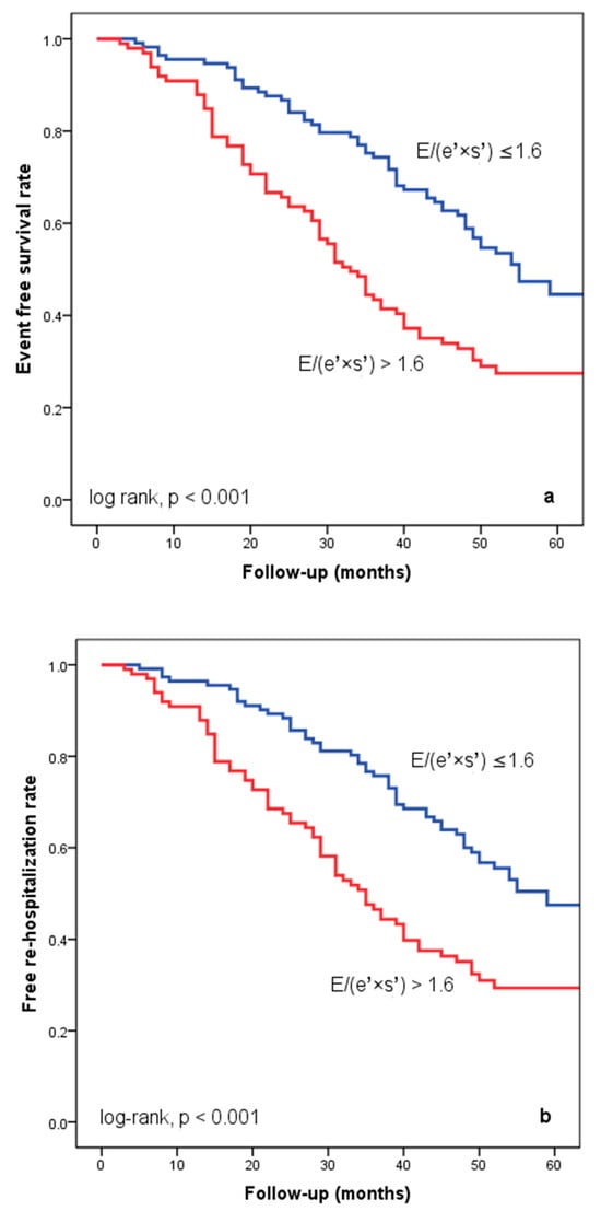 At hospital release, Group II’s mean E/(e′ × s′) was 2.8 ± 0.95, whereas Group I’s mean E/(e′ × s′) was 0.91 ± 0.35 (p < 0.001). Group II had significantly more occurrences of the composite endpoint (79 events, 70.7% versus 57 events, 50.4%; p < 0.001) than Group I. The group exhibiting E/(e′ × s′) > 1.6 (log-rank, p < 0.001) had a significantly lower cardiac event-free survival rate over the follow-up period, according to the Kaplan–Meier analysis. (Figure 2a). The same group had higher re-hospitalization and cardiac death rates (Figure 2b,c). The cohort patient group had 76 patients with HF with a reduced EF (LVEF ≤ 40%) (24 patients with functional class NYHA I, and 112, NYHA II) and 136 patients with an LVEF > 40% (7 patients with NYHA I, and 69, NYHA II) (p = 0.108). Irrespective of the LVEF value, an index > 1.6 was associated with an unfavorable prognosis (Figure 3).