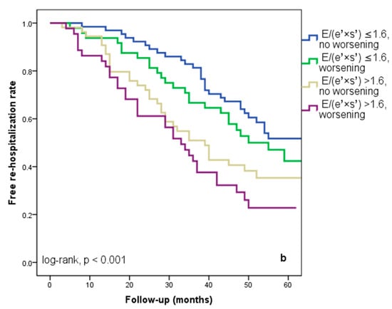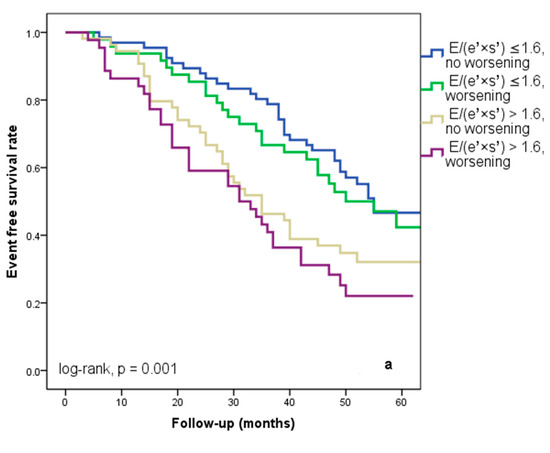 Kaplan–Meier event-free survival curves for cardiac events (a), re-hospitalization (b), and cardiac death (c) in patients at an early stage of heart failure according to the initial E/(e′ × s′) ratio at hospital discharge (above or below 1.6) and worsening or no worsening after three months. E represents early diastolic transmitral velocity, e’ signifies early mitral annular diastolic velocity, and s’ denotes systolic mitral annular velocity.