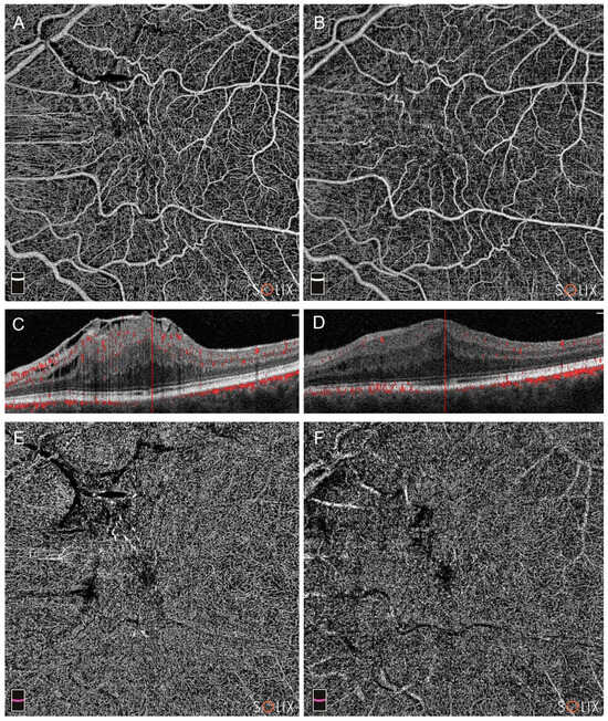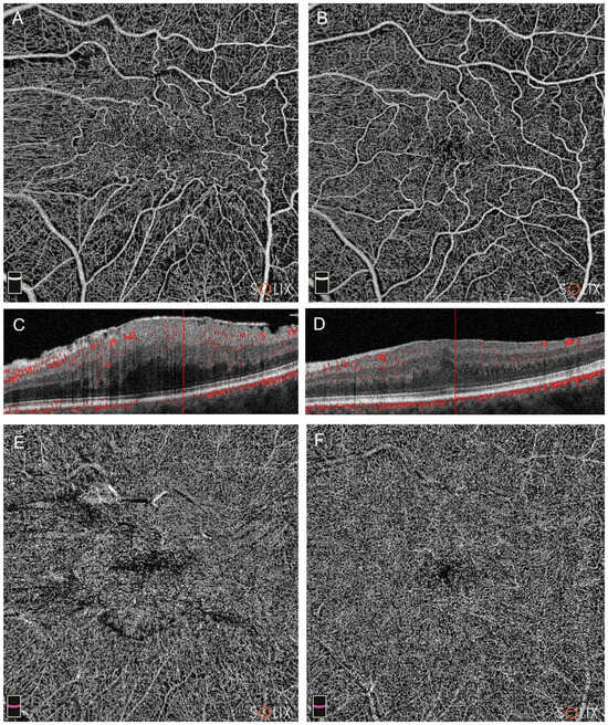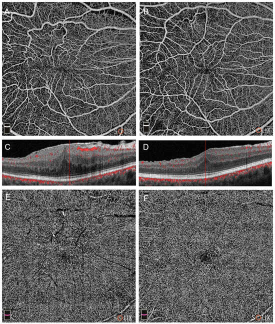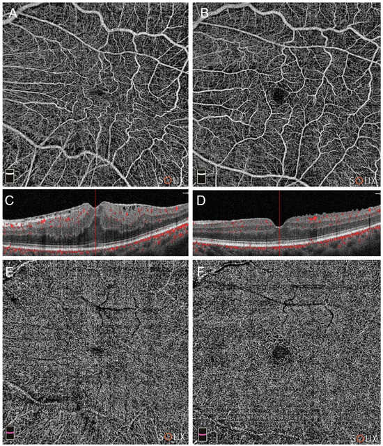 The OCT/OCT-A scans were performed using the full-range OCT Solix system (Optovue Inc., Freemont, CA, USA). Scans with low-quality indices (<7/10) due to significant lens opacities, frequent eyelid blinking, excessive motion artifacts, and other factors were rejected. The OCTA images were acquired using the AngioVue Retina software (Optovue Inc., Freemont, CA, USA), which automatically assessed the vascular density (VD) of the superficial and deep capillary plexuses (SCP, DCP) in the entire macular region corresponding to a 6.4 mm × 6.4 mm field centered on the fovea. Parameters such as Whole Image (the entire image) and Fovea (the area within the 1 mm central ring of the ETDRS grid) were evaluated. Additionally, the RetinaCube software evaluated the central macular thickness (CMT). For the SCP, en face images were obtained using the automatic segmentation between the inner boundary (internal limiting membrane, ILM) and the outer boundary (inner plexiform layer). The DCP was identified between the outer plexiform layer and the inner plexiform layer. Each OCTA image underwent motion correction and 3D projection artifact removal technology to improve image quality.