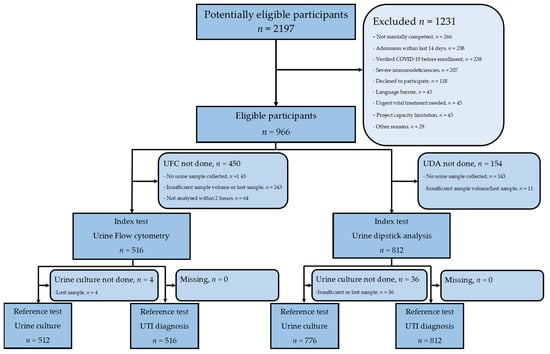 Of 2.197 patients assessed for eligibility, 1231 were excluded or declined to participate. We enrolled 966 patients in the study and performed urine cultures on 786 (81.4%), of which 337 (42.9%) were positive. Out of 516 patients where UFC was performed, 512 also had urine cultures performed, while out of 812 patients who had UDA performed, 776 had urine cultures performed. Of the enrolled patients, 200 (20.7%) were diagnosed with UTI, 589 (61.0%) had other infections, and 177 (18.3%) had no infection (Figure 1).
