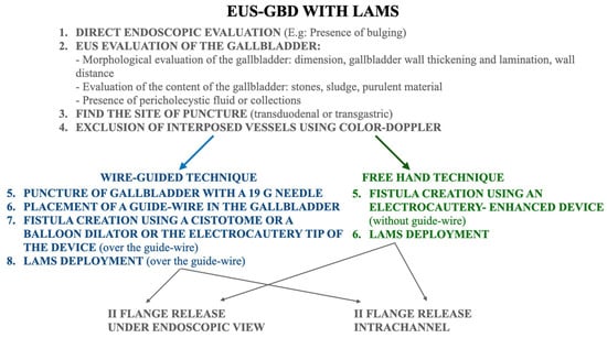 The EUS procedures were performed using linear array echoendoscopes using carbon dioxide insufflation. Patients were under deep sedation or general anesthesia at the discretion of the anesthesiologist. A morphological assessment of the gallbladder was carried out under EUS-view, and based on the ultrasound results, the most suitable window of access—whether transgastric or transduodenal—was determined. After the identification of the puncture site, using color doppler, interposed vessels were excluded. When a cold system was used, the gallbladder was punctured with a 19-gauge needle, followed by aspiration of bile or contrast injection in order to confirm the correct positioning and placement of a 0.025- or 0.035-inch guidewire [16,23]. Over the guidewire, the needle track was dilated using a cystotome (settings: pure cut mode, 100 Watts) and/or a biliary balloon; then the delivery system of the stent was inserted, and the LAMS was deployed under fluoroscopic and endoscopic control.