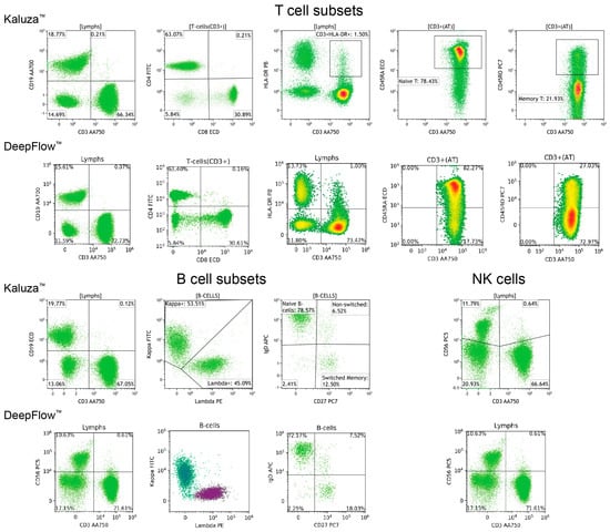 Comparison of MFC plots generated by KaluzaTM and AI DeepFlowTM for normal T, B, and NK cells.