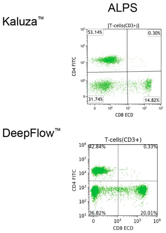 A comparison of MFC plots generated by KaluzaTM and AI DeepFlowTM for a patient with ALPS reveals that DNTs in the left lower quadrant constitute approximately 30% of the total CD3+ T cells.