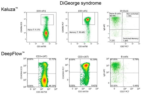 Proper cell classification is fundamental for achieving accurate flow cytometry analysis. Employing manual analysis with KaluzaTM software as the gold standard, the DeepFlowTM AI accurately classified T, B, and NK cells, as well as vital immune cell subsets, including CD8+ cytotoxic T cells, CD4+ helper T cells, CD45RA+ T cells, CD45RO+ T cells, kappa and lambda light chains, and class-switched or non-switched B cells (Figure 3). When it comes to disease conditions, AI can also recognize and classify normal and abnormal subsets. Figure 4 illustrates a case of an ALPS patient presenting with lymphocytosis and lymphadenopathy. The DNT population, comprising approximately 30% of the total CD3+ T cells, was identified in the left lower quadrant. This percentage exceeds the essential criterion of 2.5% of CD3+ lymphocytes. In a separate case, AI identified a significantly decreased CD45RA+ level, approximately 8% (reference range 30–60%), in the first plot, a corresponding increase in CD45RO+ level in the second plot, and a decreased count of switched memory B cells at <2% (reference range >5%). The overall pattern is compatible with DiGeorge syndrome (Figure 5).