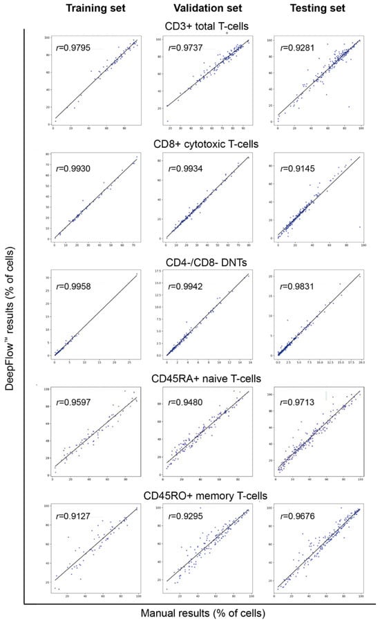 Comparison of correlation coefficients of essential T-cell subsets between manual analysis using KaluzaTM and AI analysis by DeepFlowTM reveals correlation coefficients greater than 0.9 for all three sets.Each dot represents one case.