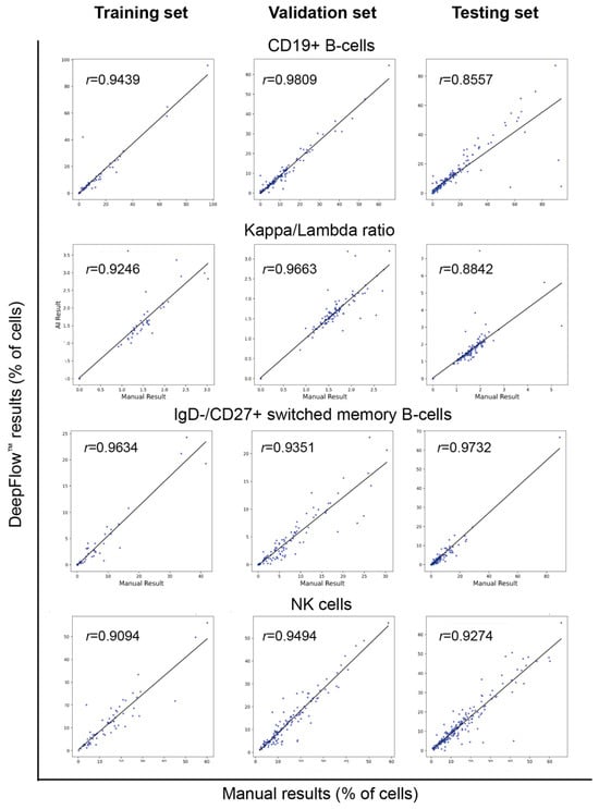 The enumeration and percentage of cells are crucial for diagnosing diseases, as the threshold of cells may determine the diagnosis of different entities. The Pearson correlation coefficient was calculated for each cell subtype between manual KaluzaTM and DeepFlowTM AI results. The correlation plots demonstrated strong correlations (r > 0.9 or very close to 0.9) in both T, B, and NK cells, as well as their subsets, across all three study sets (Figure 6 and Figure 7). Such a strong correlation verifies the accuracy of AI-assisted flow analysis.