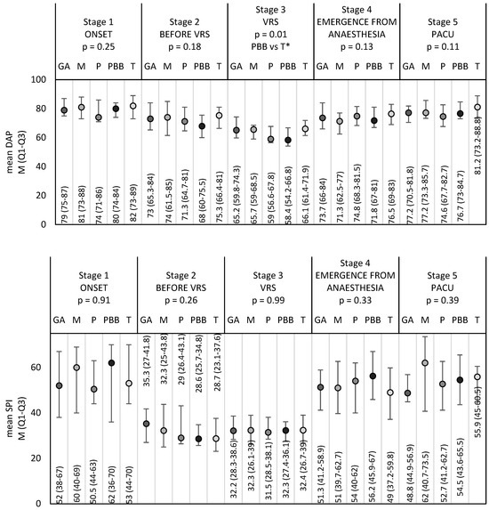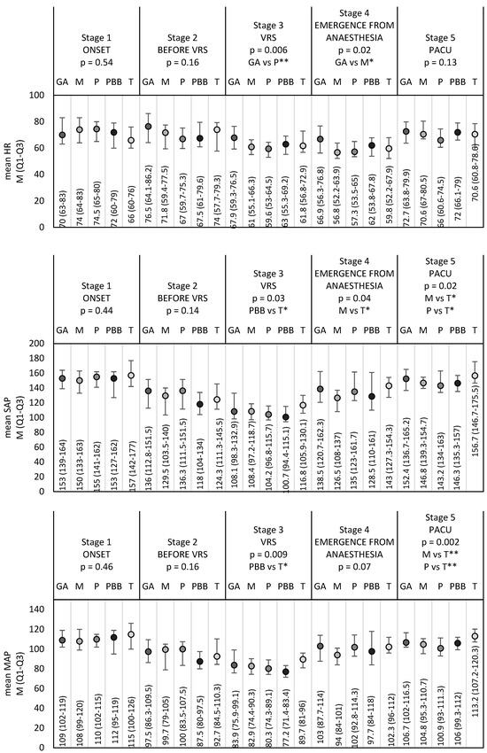 Comparison of the monitored patient parameter mean values (M (IQR)) at the same stage between the studied groups. The p-values were determined via one-way ANOVA or the Kruskal–Wallis test. The following symbols are defined thusly via post hoc tests: *—p < 0.05 and **—p < 0.01. Abbreviations: M, median; Q1, down quartile; Q3, upper quartile; HR, heart rate; VRS, vitreoretinal surgeries; SAP, systolic arterial pressure; PACU, Post-Anesthesia Care Unit; MAP, mean arterial pressure; DAP, diastolic arterial pressure; SPI, surgical pleth index; SE, state entropy; GA Group, the general anesthesia group; M Group, the metamizole group; P Group, the paracetamol group; PBB group, the peribulbar block group; and T Group, the topical anesthesia group.