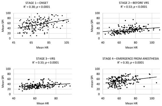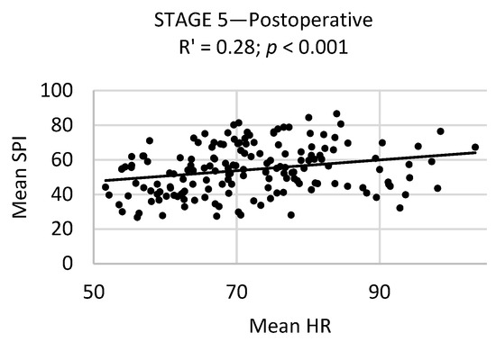 The correlation analysis of the mean monitored patients’ parameters showed a significant positive correlation between the mean SPI and mean HR for all of the patients at every stage (Figure 2). This meant that, with the increase in the mean HR, the mean SPI increased significantly.