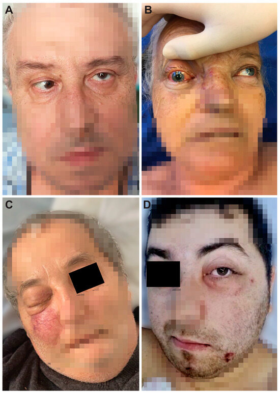 | 3, 64, M | Cluj-Napoca | seven weeks | type 2, compensated | No | Right exophthalmos, immobility of the right eye, right oculomotor paralysis, mucopurulent secretions in the right nostril. | MRI and CT: Right pansinusitis with inhomogeneous content, right intraorbital abscess. | HP: Aseptate hyphae, angioinvasion, polymorphonuclear. SEM: Hyphae, immune cells (Figure 5B–D). TEM: Aseptate hyphae, bacteria. |