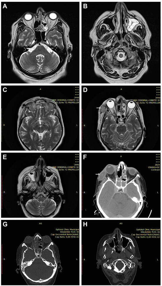 | 2, 66, F | Cluj-Napoca | six weeks | - | Yes | Swelling of the right zygomatic region, exophthalmos with immobility of the right eye, complete right blepharoptosis (Figure 1B). Extensive mucosal necrosis in the right nostril (Figure 3A–D). | MRI and CT performed at 2-week intervals. MRI: Right paramedian frontal cerebral intraparenchymal abscess (Figure 2C), altered sphericity of the right eyeball, bilateral pansinusitis with inhomogeneous content (Figure 2D,E), zygomatic abscess (Figure 2D, arrow). CT: Bone erosions in the right nasal cavity, zygomatic abscess (Figure 2F). Extensive lesions compared to previously performed MRI. | HP: Aseptate hyphae, angioinvasion, vascular necrosis, hemorrhage (Figure 4B), polymorphonuclear. SEM: Hyphae (Figure 5A), immune cells. TEM: Aseptate hyphae (Figure 6A,B), bacteria. |