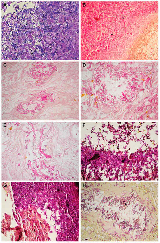 - Sree Lakshmi, I.; Kumari, B.S.; Jyothi, C.; Devojee, M.; Padma Malini, K.; Sunethri, P.; Bheemrao Somalwar, S.; Kavitha, T. Histopathological Study of Mucormycosis in Post COVID-19 Patients and Factors Affecting it in a Tertiary Care Hospital. Int. J. Surg. Pathol. 2023, 31, 56–63. [Google Scholar] [CrossRef] [PubMed]