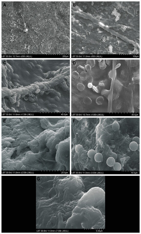 | 5, 69, F | Timisoara | two months | type 2, decompensated | Yes | Denudation and infiltration of the hard palate (Figure 3E), oronasal fistula (Figure 3F), mucosal necrosis in the right nasal cavity, perforation of the nasal septum (Figure 3G–J). | CT: Right pansinusitis with inhomogeneous content. | HP: Wide aseptate hyphae, angioinvasion, polymorphonuclear. SEM: Hyphae, immune cells, bacterial biofilm. TEM: Aseptate hyphae, bacteria (Figure 6D). |