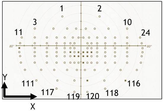 To examine the reliability of each test point, the 120 test points in the EVFT were numbered in an order that considered the four quadrants around the center point. The upper quadrants were considered positive on the Y-axis, while the lower quadrants were considered negative. Similarly, the right quadrants were positive on the X-axis, and the left quadrants were negative. Numbering was performed by the values on the Y-axis decreasing, or by the ascending X-axis values if the Y-axis values were the same (Figure 1). The coordinates for each of the 120 EVFT locations, provided by Carl Zeiss Meditec, are shown in Table 1.