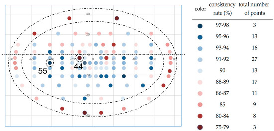 Color map of EVFT consistency rate by test point. The highest agreement rate was found in point number 55 (98.1%), and the lowest agreement rate was found in point number 44 (74.0%). The agreement rate for the most peripheral 24 test points (area enclosed by the dashed circle line) was significantly lower than that of agreement rate for the other 96 test points. The agreement rates of the upper visual field (38 test points) were significantly lower than the agreement rates of the lower field (82 test points), which is divided by dashed line.