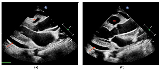 Transthoracic echocardiography (PSLA view) showing the anechoic separation of the pericardial layers measuring 1.4 cm in diastole (arrow). (a) Right ventricle (RV) systolic collapse is shown on the left image; (b) right ventricular outflow tract diastolic collapse can be seen on the right image.